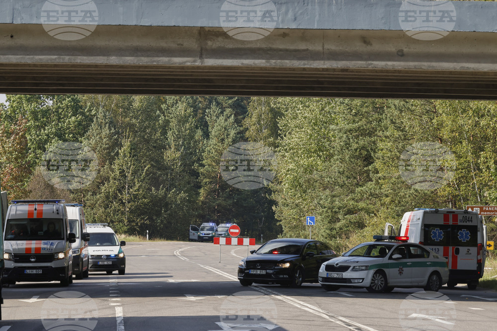 Ambulances and police cars are parked on the road not far from the area of powerful explosions after several rail cars loaded with liquefied gas caught fire in the suburbs of Vilnius, Lithuania, Wednesday, Sept. 10, 2025. (AP Photo/Mindaugas Kulbis)