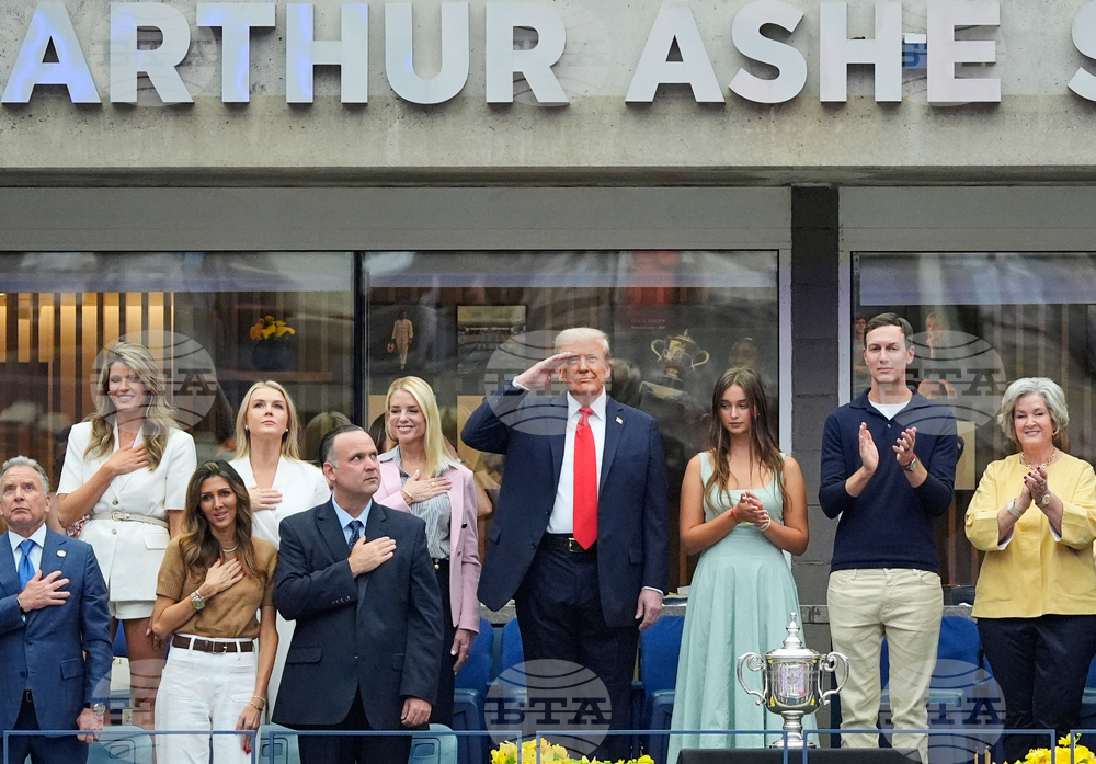 FILE - President Donald Trump, center, and others stand for the national anthem before the US Open tennis men's singles final, Sept. 7, 2025, in Flushing, N.Y. (AP Photo/Manuel Balce Ceneta, File)