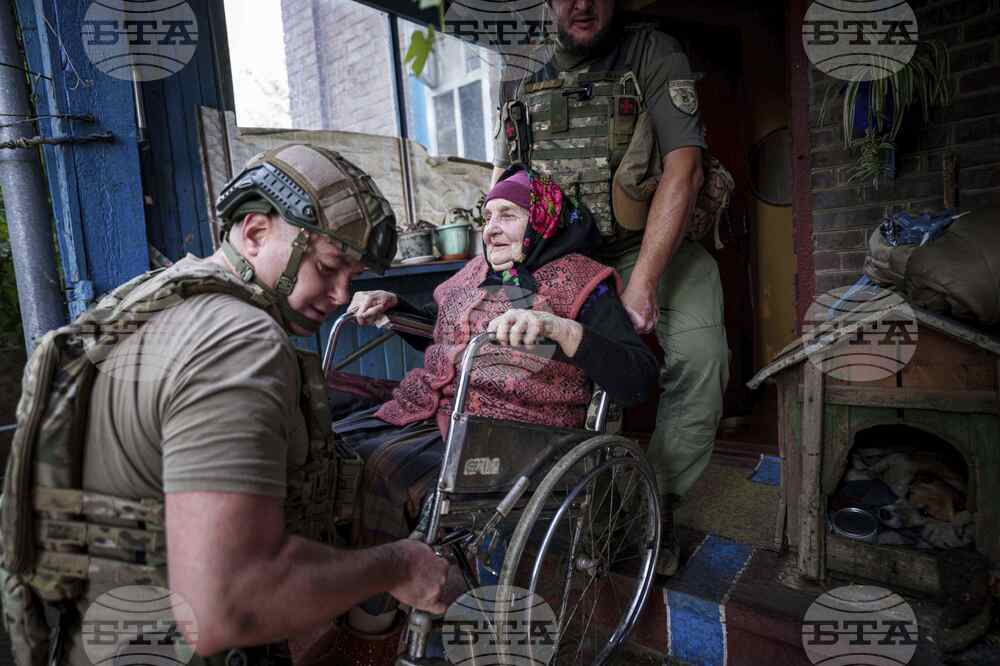 Police officers evacuate Maria Hodus, 90, from her house in Kostiantynivka, Ukraine, Tuesday, Sept. 2, 2025. (AP Photo/Evgeniy Maloletka)
