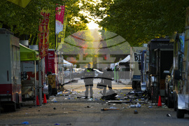 FILE - Members of the Vancouver Police forensics team examines the scene where a vehicle drove into a crowd during a Filipino heritage festival in Vancouver, Canada, April 27, 2025. (Sean Kilpatrick/The Canadian Press via AP, File)