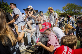 Charlie Kirk hands out hats before speaking at Utah Valley University in Orem, Utah, Wednesday, Sept. 10, 2025. (Tess Crowley/The Deseret News via AP)