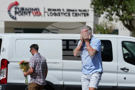A well-wisher is overcome after dropping off flowers, Wednesday, Sept. 10, 2025, at the national headquarters of Turning Point USA in Phoenix, following the shooting death of Charlie Kirk, the 31-year-old CEO of the organization, at a Utah college. (AP Photo/Ross D. Franklin)