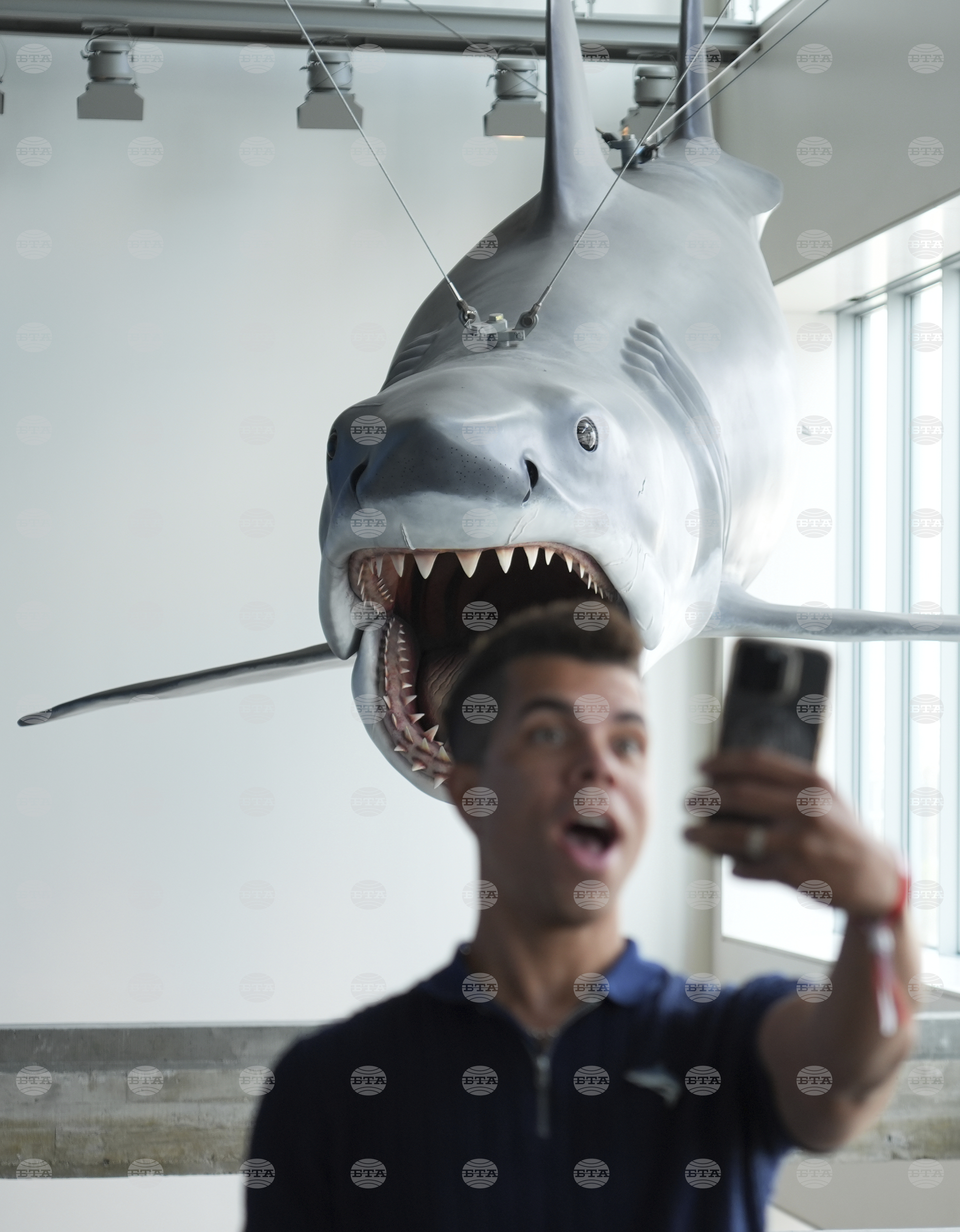 A visitor to the "Jaws: The Exhibition" press preview shoots a selfie underneath the sole surviving full-scale model of "Bruce," the shark from the 1975 film, on Wednesday, Sept. 10, 2025, at the Academy Museum of Motion Pictures in Los Angeles. (AP Photo/Chris Pizzello)