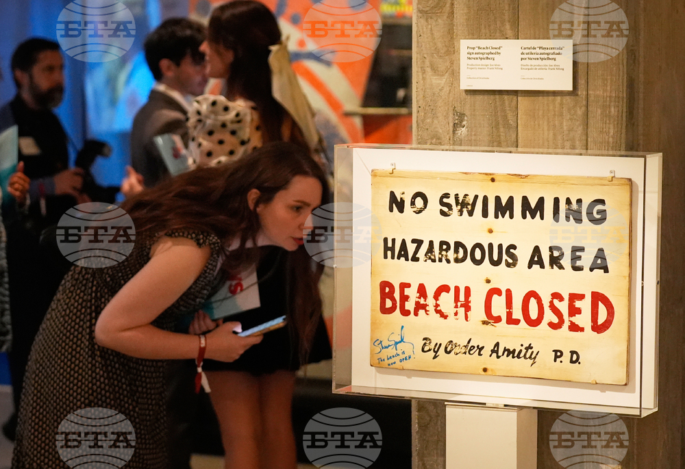 Visitors to the "Jaws: The Exhibition" press preview peruse items on display near a prop "beach closed" sign autographed by the film's director Steven Spielberg on Wednesday, Sept. 10, 2025, at the Academy Museum of Motion Pictures in Los Angeles. (AP Photo/Chris Pizzello)