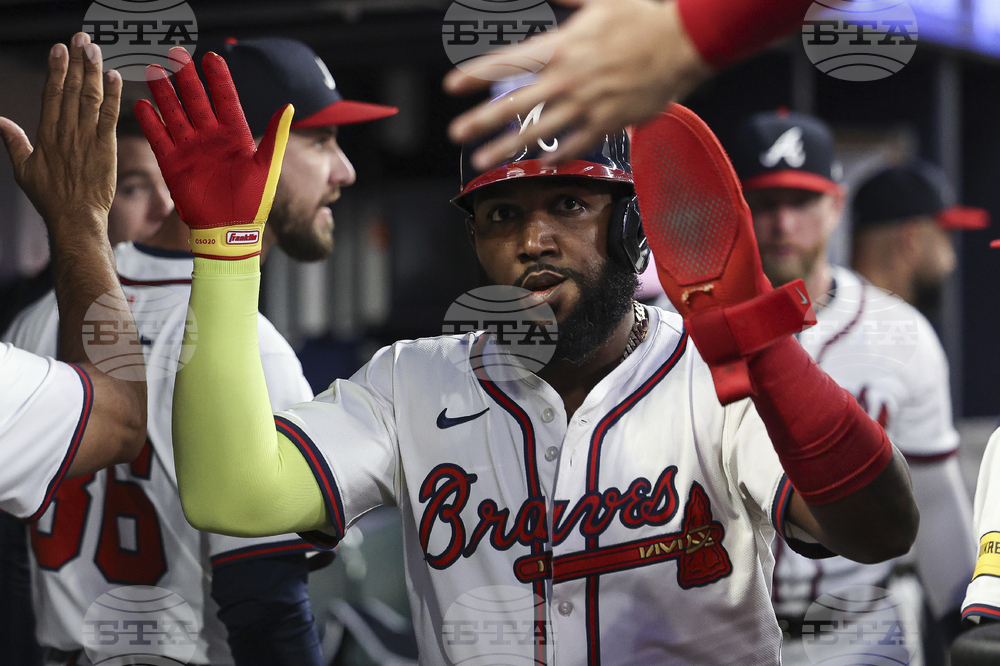 Atlanta Braves' Marcell Ozuna high-fives teammates in the dugout after scoring a run in the third inning of a baseball game against the Chicago Cubs, Wednesday, Sept. 10, 2025, in Atlanta. (AP Photo/Colin Hubbard)