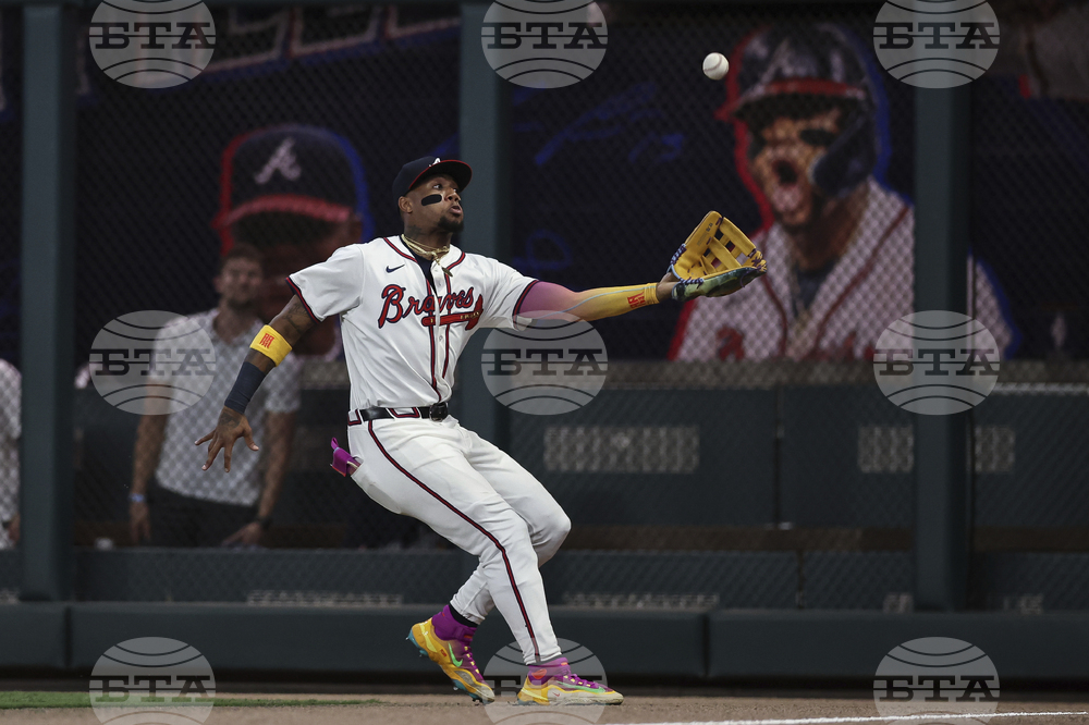 Atlanta Braves outfielder Ronald Acuña Jr. gets ready to catch a fly ball in the fifth inning of a baseball game against the Chicago Cubs, Wednesday, Sept. 10, 2025, in Atlanta. (AP Photo/Colin Hubbard)