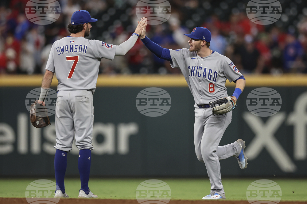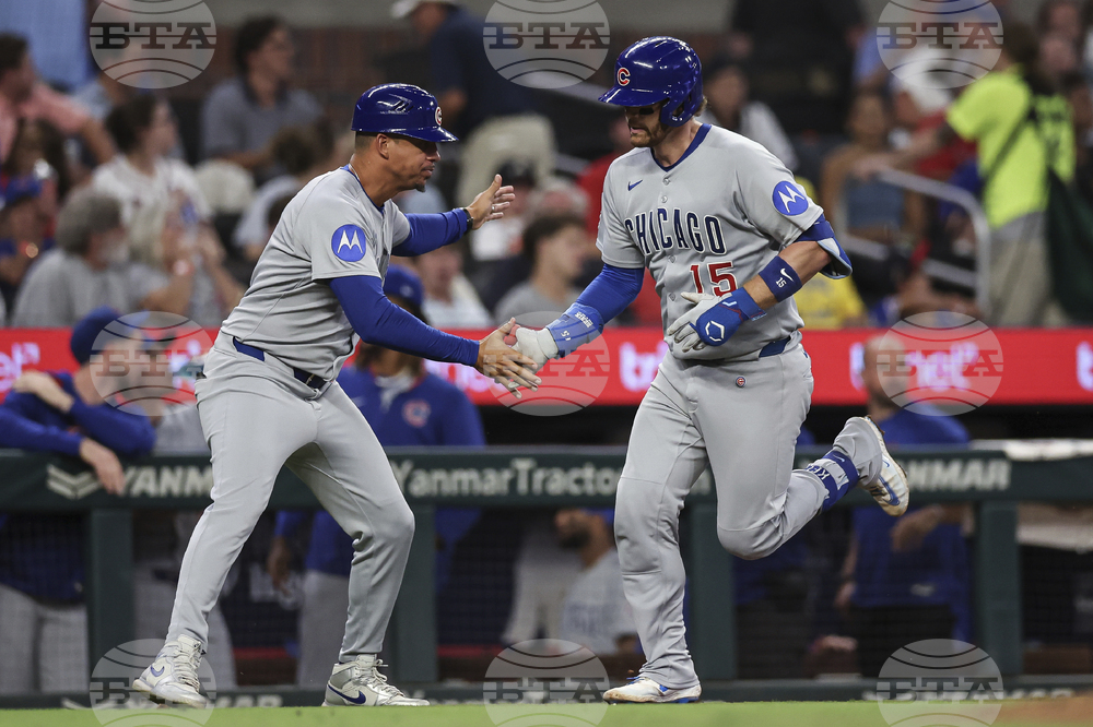 Chicago Cubs' Dansby Swanson (7) high-fives Ian Happ (8) after a baseball game against the Atlanta Braves, Wednesday, Sept. 10, 2025, in Atlanta. (AP Photo/Colin Hubbard)