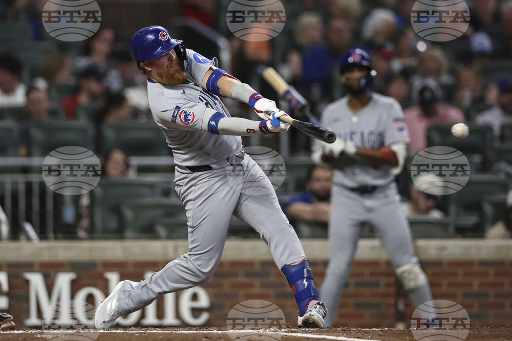 Chicago Cubs' Justin Turner hits an RBI double in the fourth inning of a baseball game against the Atlanta Braves, Wednesday, Sept. 10, 2025, in Atlanta. (AP Photo/Colin Hubbard)