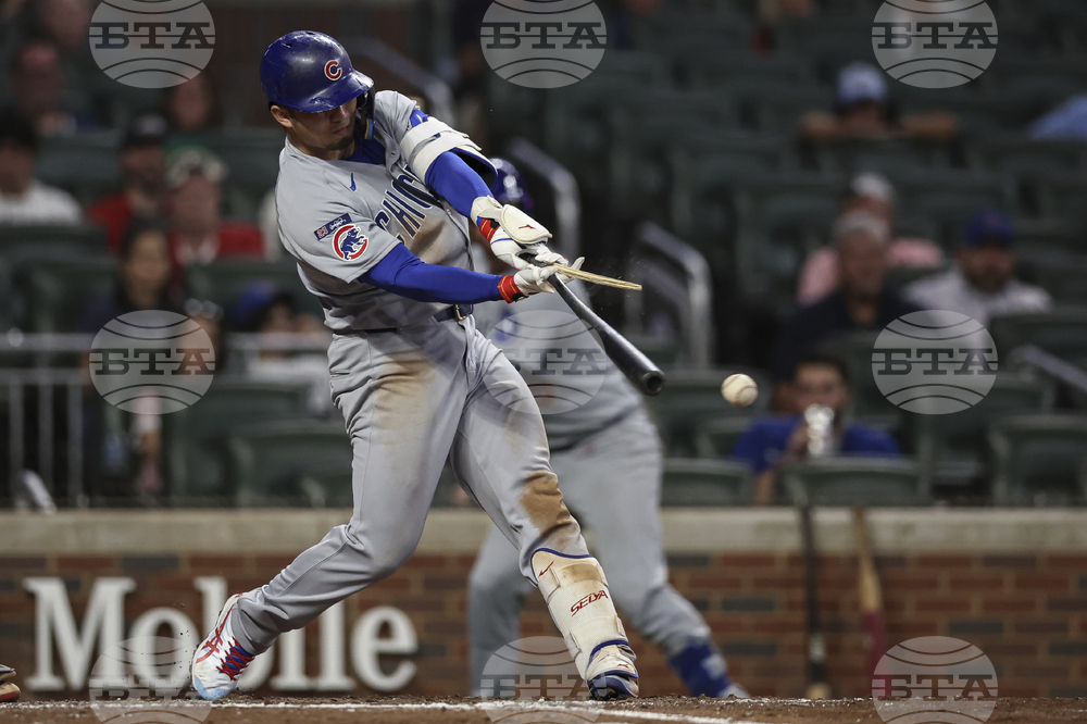 Chicago Cubs' Seiya Suzuki breaks his bat while hitting a single in the ninth inning of a baseball game against the Atlanta Braves, Wednesday, Sept. 10, 2025, in Atlanta. (AP Photo/Colin Hubbard)