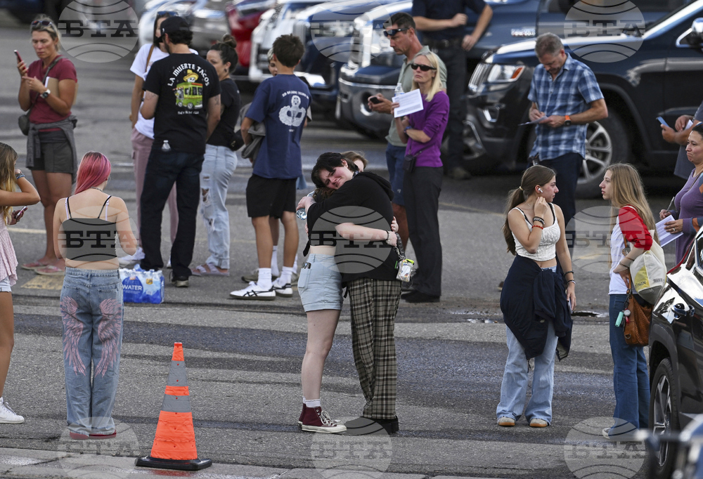 Students reunite with loved ones and classmates outside Bergen Meadow Elementary School after a shooting at nearby Evergreen High School Wednesday, Sept. 10, 2025, in Evergreen, Colo. (RJ Sangosti/The Denver Post via AP)