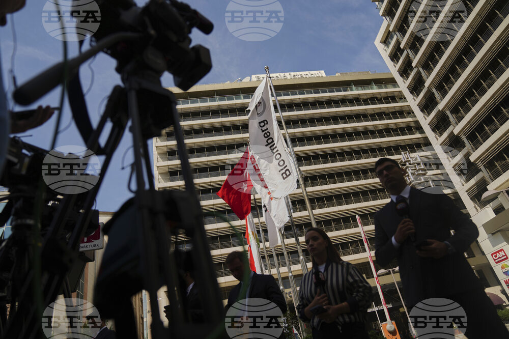 Journalists work outside Haberturk and ShowTv news broadcasters offices, both part of Turkish Can Holding media group, in Istanbul, Turkey, Thursday, Sept. 11, 2025. (AP Photo/Francisco Seco)