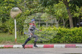 A police man runs as he provides security in front of Union Election Commission office, in Naypyitaw, Myanmar, Thursday, Sept. 11, 2025. (AP Photo/Aung Shine Oo)
