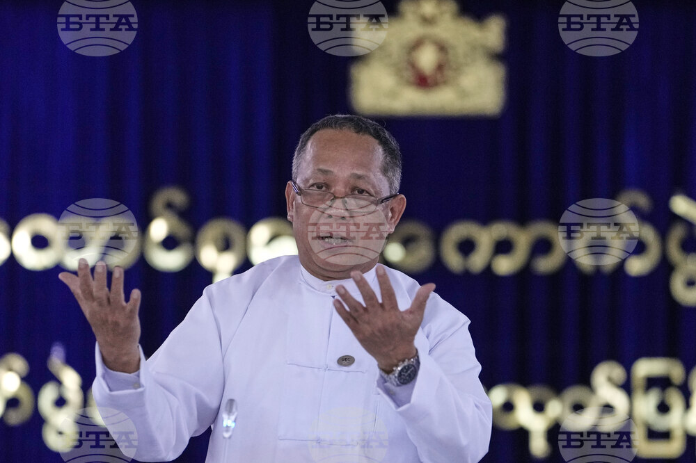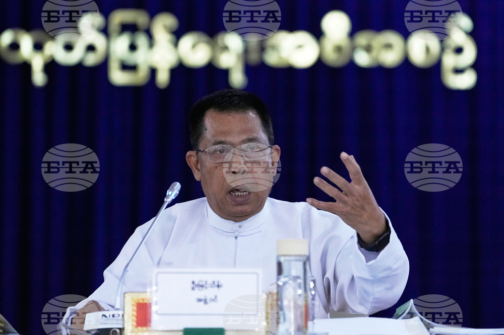 Khin Maung Oo, a member of the Union Election Commission, talks to journalists during a press conference at the Union Election Commission (UEC) in Naypyitaw, Myanmar, Thursday, Sept. 11, 2025. (AP Photo/Aung Shine Oo)