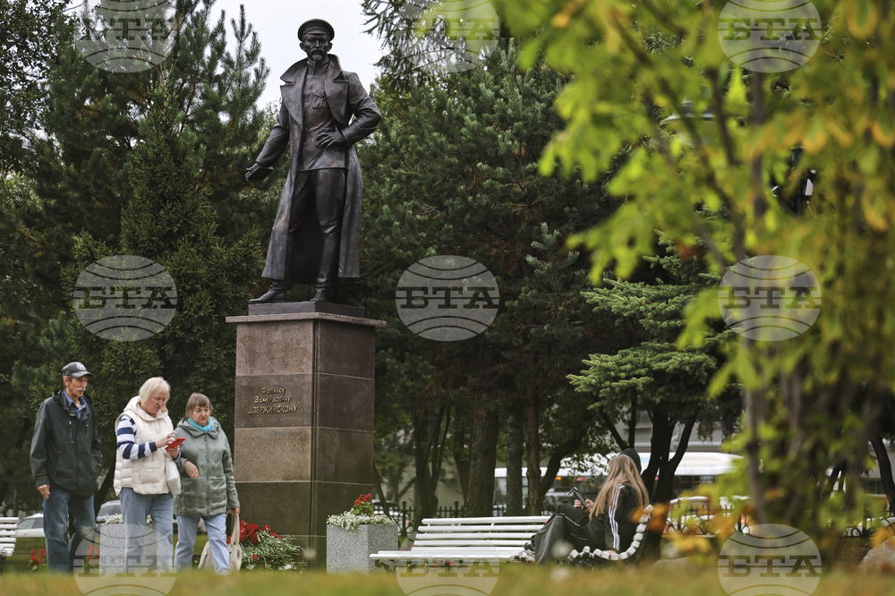 People walk past recently unveiled statue of the founder of the KGB, Felix Edmundovich Dzerzhinsky, in Omsk, Russia, Thursday, Sept. 11, 2025. (AP Photo)