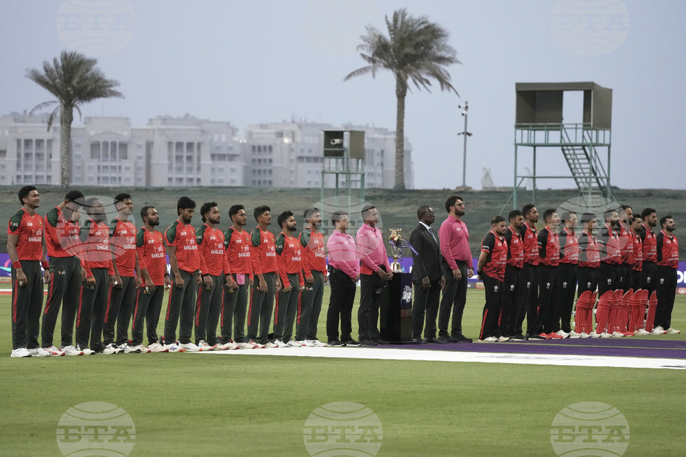 Bangladesh's cricket players and Hong Kong's cricket players stand for their national anthem during the Asia Cup Cricket match between Bangladesh and Hong Kong at Zayed Cricket Stadium in Abu Dhabi, United Arab Emirates, Thursday, Sept. 11, 2025. (AP Photo/Fatima Shbair)