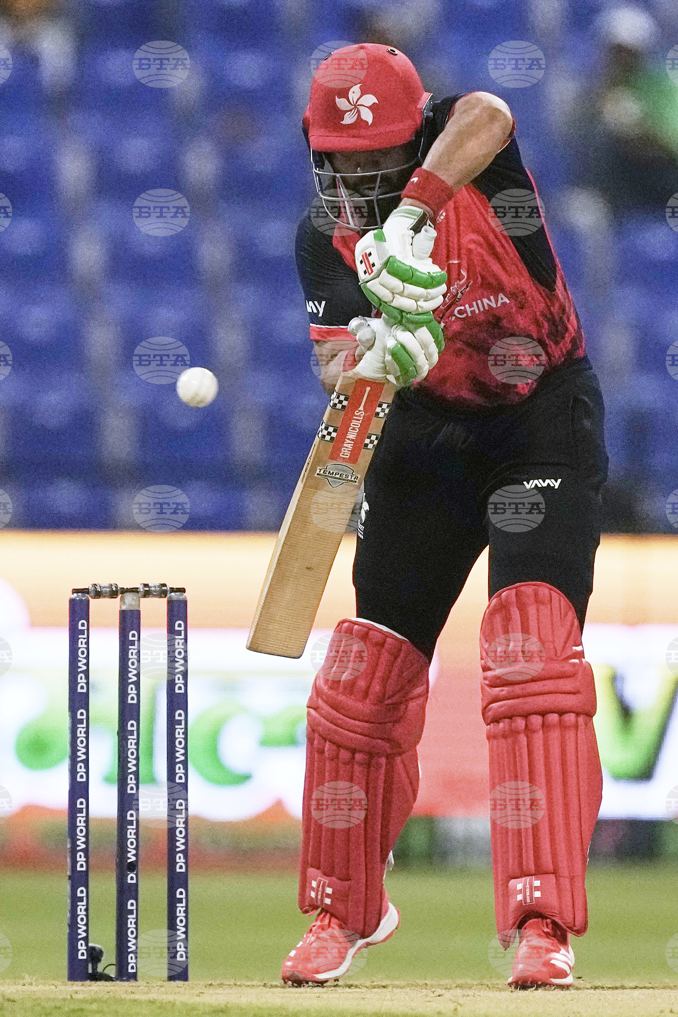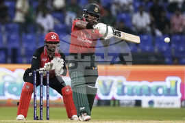 Hong Kong's Babar Hayat plays a shot during the Asia Cup Cricket match between Bangladesh and Hong Kong at Zayed Cricket Stadium in Abu Dhabi, United Arab Emirates, Thursday, Sept. 11, 2025. (AP Photo/Fatima Shbair)