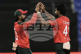Bangladesh's players celebrates the dismissal of Hong Kong's Babar Hayat during the Asia Cup Cricket match between Bangladesh and Hong Kong at Zayed Cricket Stadium in Abu Dhabi, United Arab Emirates, Thursday, Sept. 11, 2025. (AP Photo/Fatima Shbair)