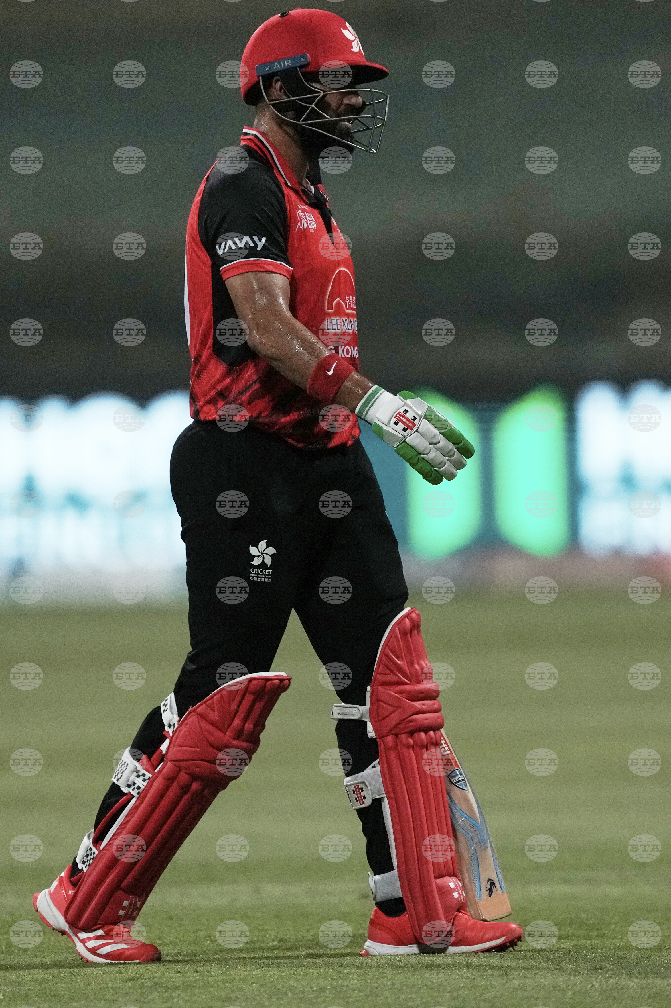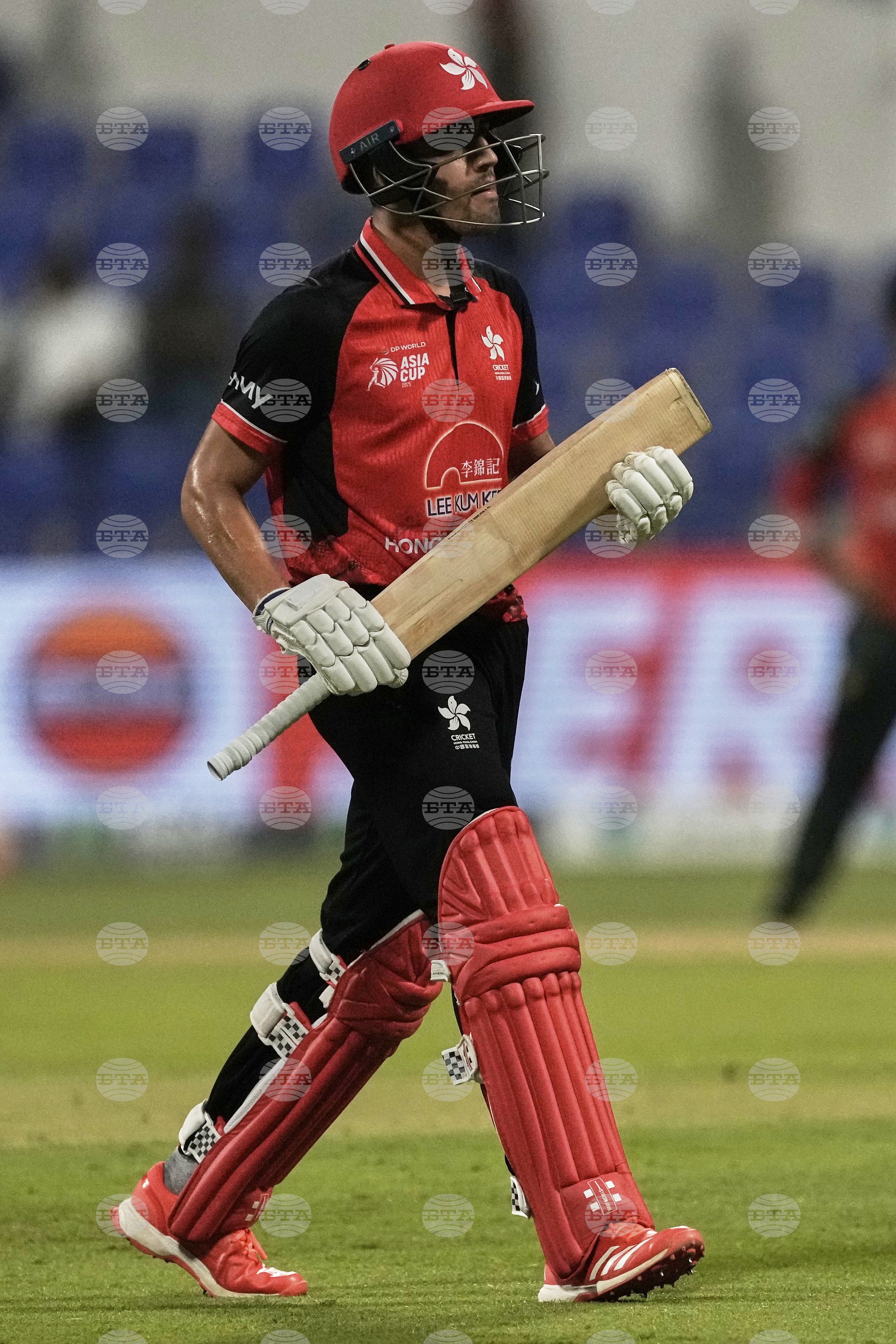 Hong Kong's Babar Hayat walks off the field after losing his wicket during the Asia Cup Cricket match between Bangladesh and Hong Kong at Zayed Cricket Stadium in Abu Dhabi, United Arab Emirates, Thursday, Sept. 11, 2025. (AP Photo/Fatima Shbair)