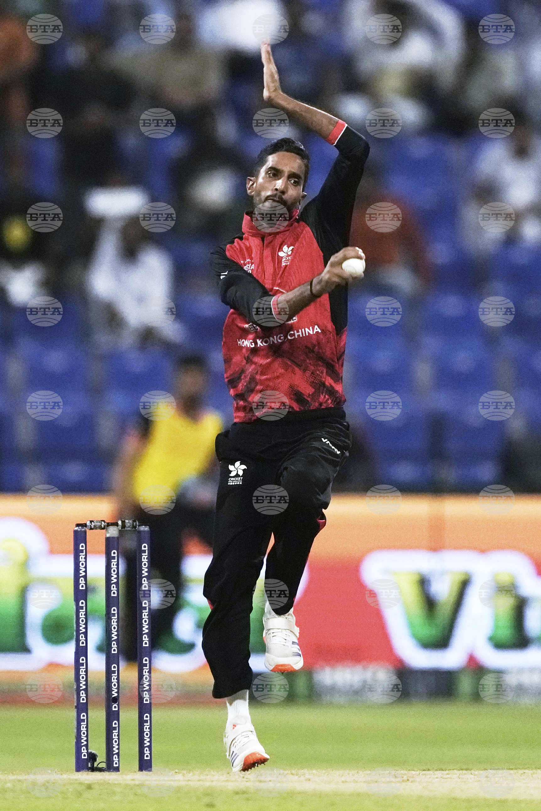 Hong Kong's Anas Khan bowls a delivery during the Asia Cup Cricket match between Bangladesh and Hong Kong at Zayed Cricket Stadium in Abu Dhabi, United Arab Emirates, Thursday, Sept. 11, 2025. (AP Photo/Fatima Shbair)