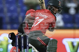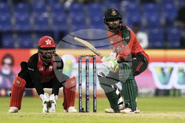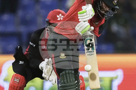 Hong Kong's Zeeshan Ali plays a shot during the Asia Cup Cricket match between Bangladesh and Hong Kong at Zayed Cricket Stadium in Abu Dhabi, United Arab Emirates, Thursday, Sept. 11, 2025. (AP Photo/Fatima Shbair)