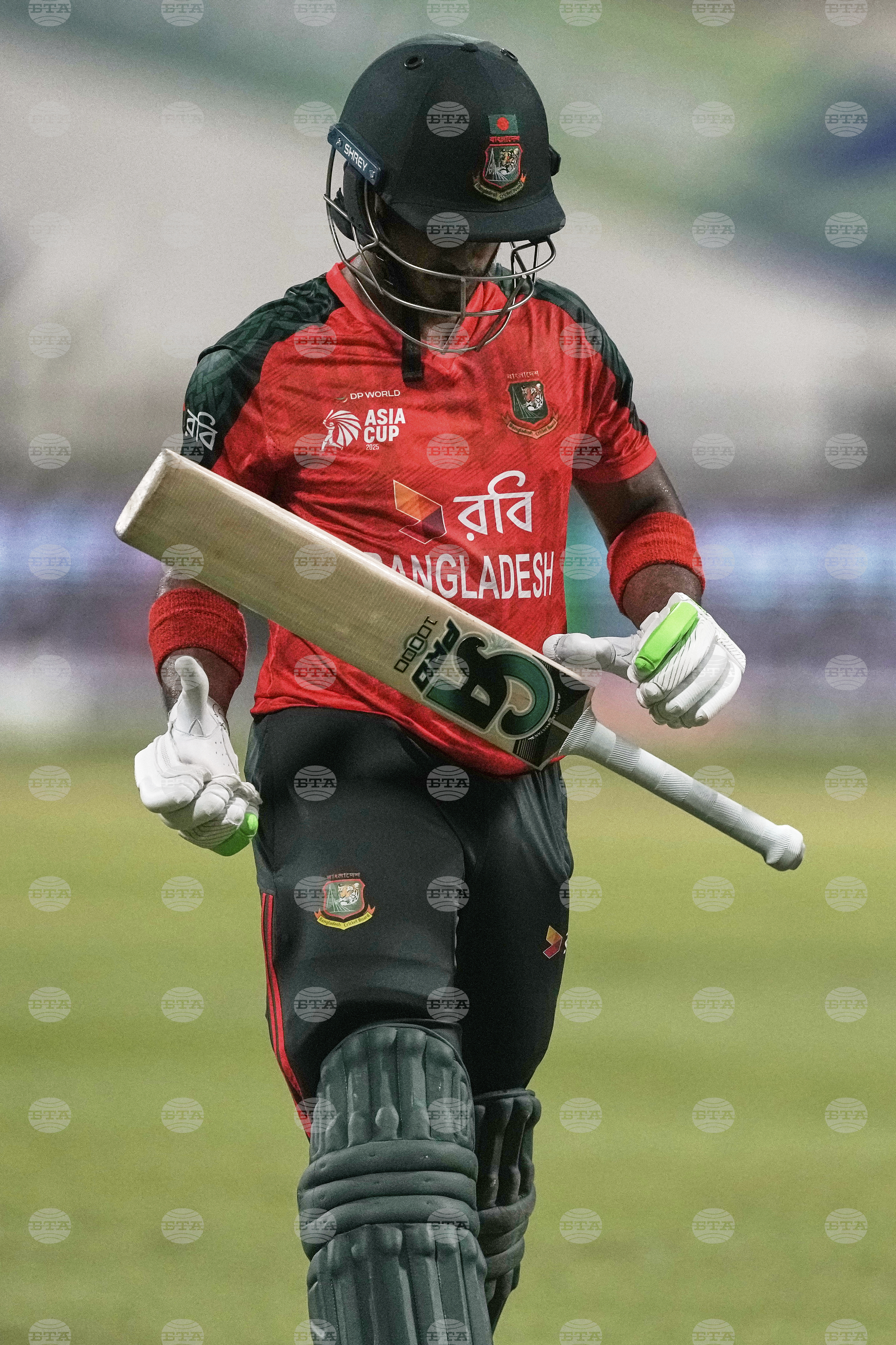 Bangladesh's Parvez Hossain Emon walks off the field after losing his wicket during the Asia Cup Cricket match between Bangladesh and Hong Kong at Zayed Cricket Stadium in Abu Dhabi, United Arab Emirates, Thursday, Sept. 11, 2025. (AP Photo/Fatima Shbair)