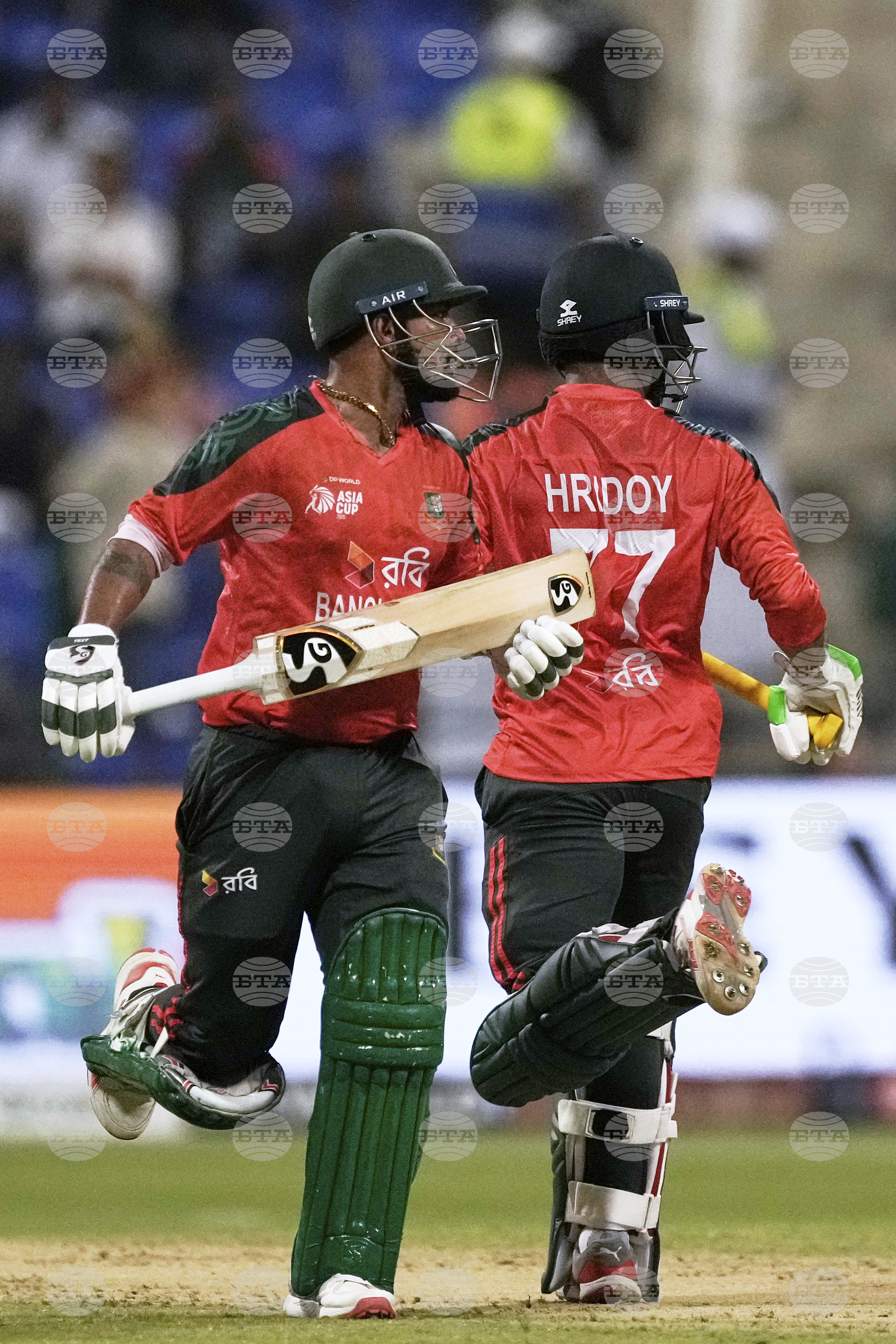Bangladesh's Towhid Hridoy, right, and Bangladesh's Litton Das run between the wickets to score during the Asia Cup Cricket match between Bangladesh and Hong Kong at Zayed Cricket Stadium in Abu Dhabi, United Arab Emirates, Thursday, Sept. 11, 2025. (AP Photo/Fatima Shbair)