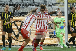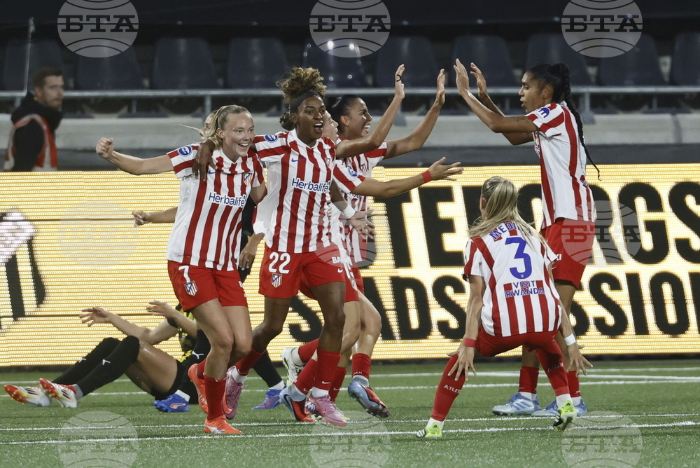 Atlético's Luany (22) celebrates after scoring a goal during a Champions League qualifying soccer match between BK Häcken and Atlético de Madrid at Bravida arena in Gothenburg, Sweden, Thursday Sept. 11 2025. (Adam Ihse/TT via AP)