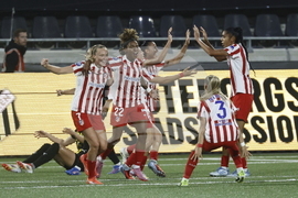 Häcken's Felicia Schröder, left, celebrates after scoring a goal during a Champions League qualifying soccer match between BK Häcken and Atlético de Madrid at Bravida arena in Gothenburg, Sweden, Thursday, Sept. 11, 2025. (Adam Ihse/TT via AP)