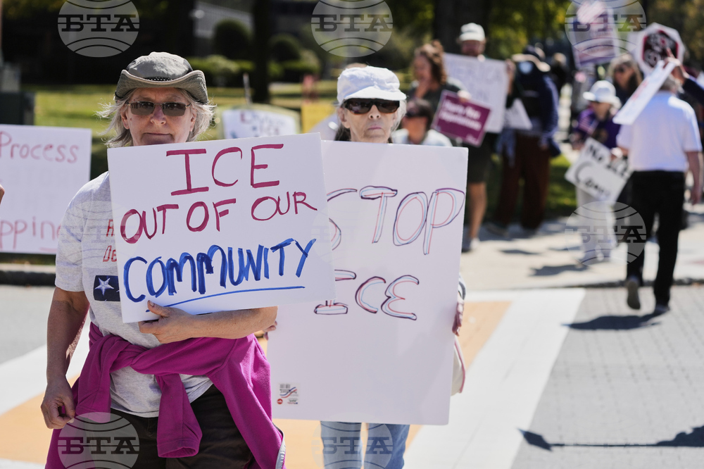 Protesters picket outside the U.S. Immigration and Customs Enforcement regional field office, at rear, Thursday, Sept. 11, 2025, in Burlington, Mass. (AP Photo/Charles Krupa)