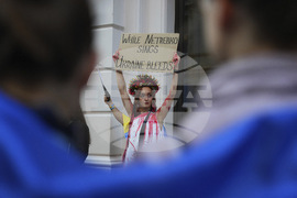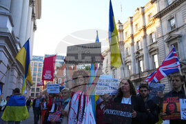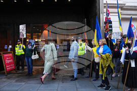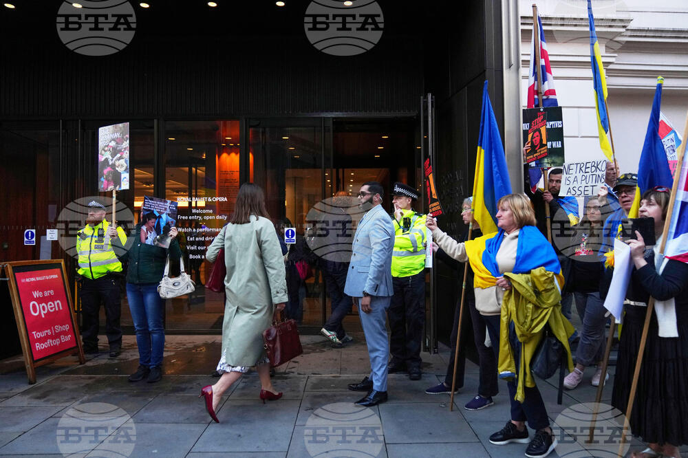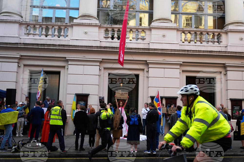 Pro-Ukraine protesters hold up placards and flags during a demonstration against the Royal Opera House in London, as the house had set an Russian opera singer to perform the lead in Puccini's Tosca. Thursday, Sept. 11, 2025. (AP Photo/Joanna Chan)