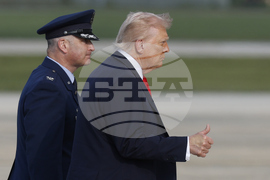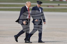 President Donald Trump, left, is escorted by Air Force Col. Christopher M. Robinson, Commander, 89th Airlift Wing, as he walks from Marine One to Air Force One at Joint Base Andrews, Md., Thursday, Sept. 11, 2025. (AP Photo/Luis M. Alvarez)