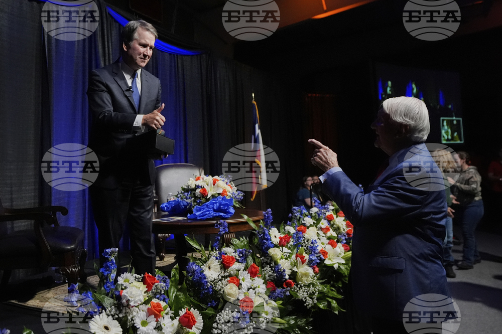 Justice Brett Kavanaugh is greeted by an attendee after he spoke at The Ken Starr Lecture at McLennan Community College Thursday, Sept. 11, 2025, in Waco, Texas. (AP Photo/Tony Gutierrez)