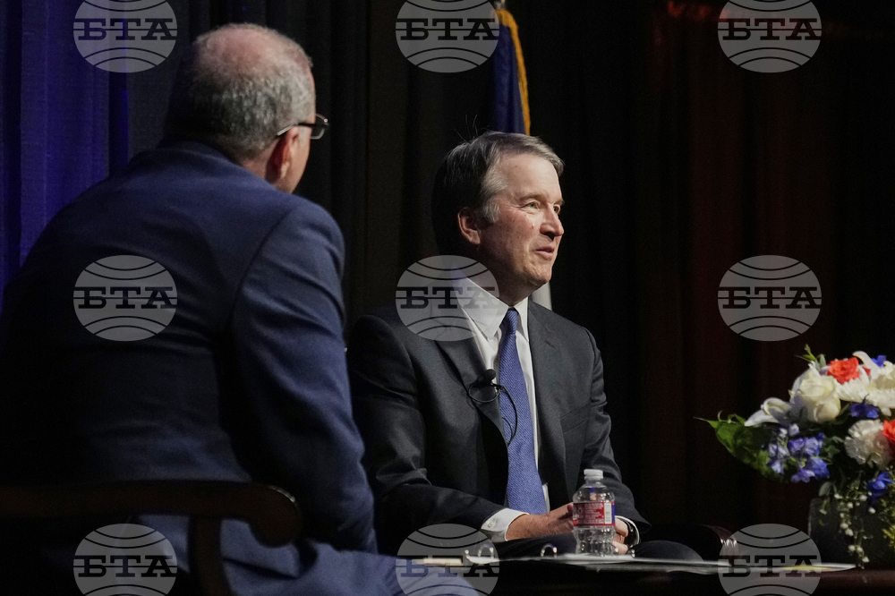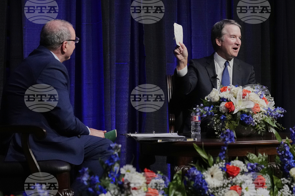 Justice Brett Kavanaugh, center right, responds to a question from Ashley Cruseturner, left, a history professor at McLennan Community College as attendees listen during The Ken Starr Lecture at the college, Thursday, Sept. 11, 2025, in Waco, Texas. (AP Photo/Tony Gutierrez)