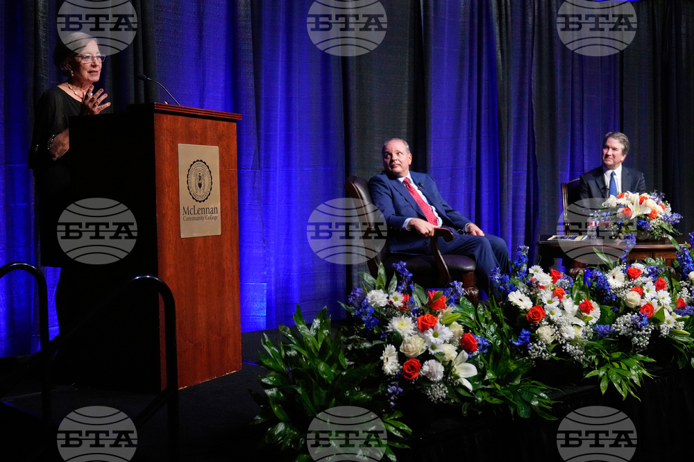 Alice Starr, at podium, the widow of Ken Starr make comments as she introduces Justice Brett Kavanaugh, right, and McLennan Community College history professor Ashley Cruseturner, center, before the start of the Ken Starr Lecture Thursday, Sept. 11, 2025, in Waco, Texas. (AP Photo/Tony Gutierrez)
