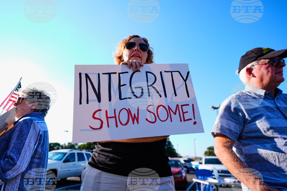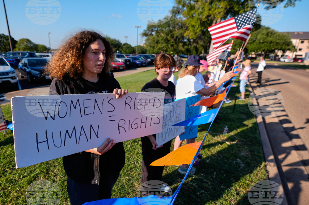 Jennifer Thrift, center, of Austin, Texas, joins several other protesters as they line the street across near a venue where Justice Brett Kavanaugh was the featured speaker at The Ken Starr Lecture at McLennan Community College Thursday, Sept. 11, 2025, in Waco, Texas. (AP Photo/Tony Gutierrez)