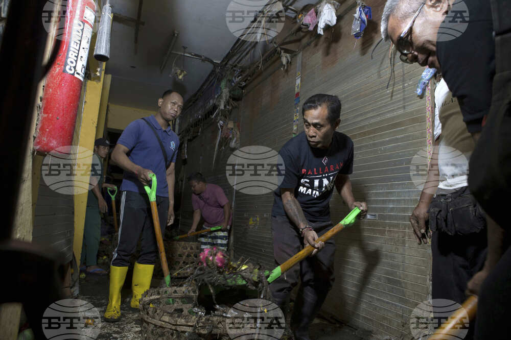 Men clean up after a flood in Badung, Bali, Indonesia on Friday, Sept. 12, 2025. (AP Photo/Firdia Lisnawati)
