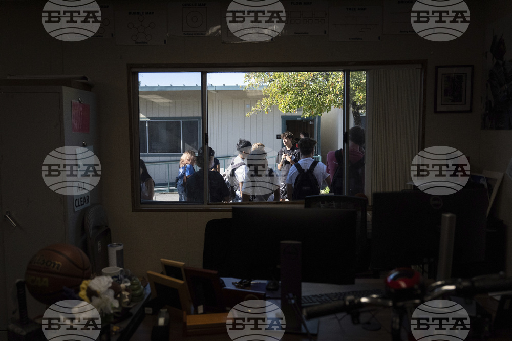 Students wait outside English teacher Casey Cuny's classroom at Valencia High School in Santa Clarita, Calif., Wednesday, Aug. 27, 2025. (AP Photo/Jae C. Hong)