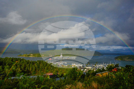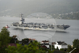 Drobak 20250912. The American aircraft carrier USS Gerald R. Ford, the world's largest warship, on its way into the Oslofjord, at Drobak in Norway, Friday Sept. 12, 2025. (Lise Aaserud/NTB Scanpix via AP)