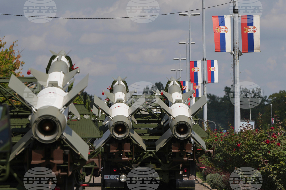 An anti-aircraft rocket system drives ahead of a military parade scheduled for Sept. 20 in the Serbian capital Belgrade, Friday, Sept. 12, 2025. (AP Photo/Darko Vojinovic)