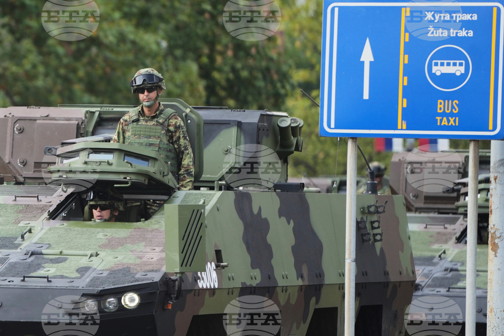 A Serbian Army soldier prepares on an armored military vehicle ahead of a military parade scheduled for Sept. 20 in the Serbian capital Belgrade, Friday, Sept. 12, 2025. (AP Photo/Darko Vojinovic)