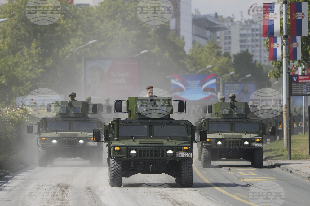 Serbian Army vehicles drive ahead of a military parade scheduled for Sept. 20 in the Serbian capital Belgrade, Friday, Sept. 12, 2025. (AP Photo/Darko Vojinovic)