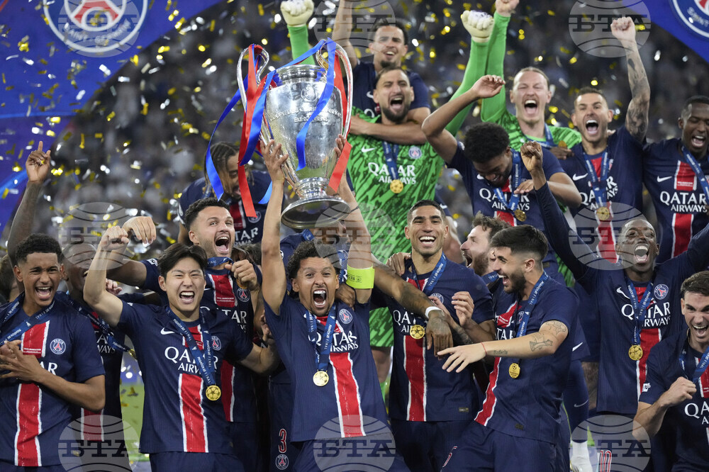 FILE - PSG players celebrate with the trophy after winning the Champions League final soccer match between Paris Saint-Germain and Inter Milan at the Allianz Arena in Munich, Germany, Saturday, May 31, 2025. (AP Photo/Matthias Schrader, File)
