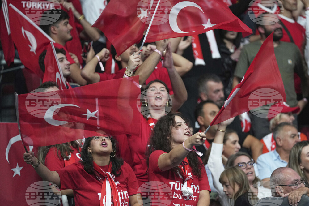 Turkey fans cheer during the Eurobasket, European Basketball Championship semi-final match between Greece and Turkey at the Riga Arena in Riga, Latvia, Friday, Sept. 12, 2025. (AP Photo/Sergei Grits)