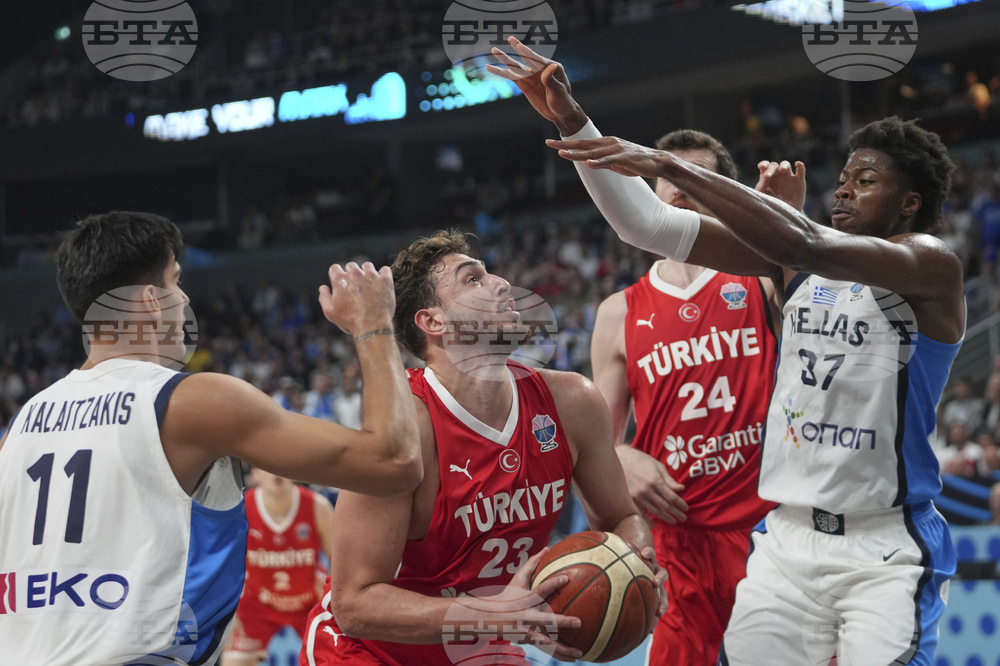 Turkey's Cedi Osman, second left, and Greece's Kostas Papanikolaou in action during the Eurobasket, European Basketball Championship semi-final match between Greece and Turkey at the Riga Arena in Riga, Latvia, Friday, Sept. 12, 2025. (AP Photo/Sergei Grits)