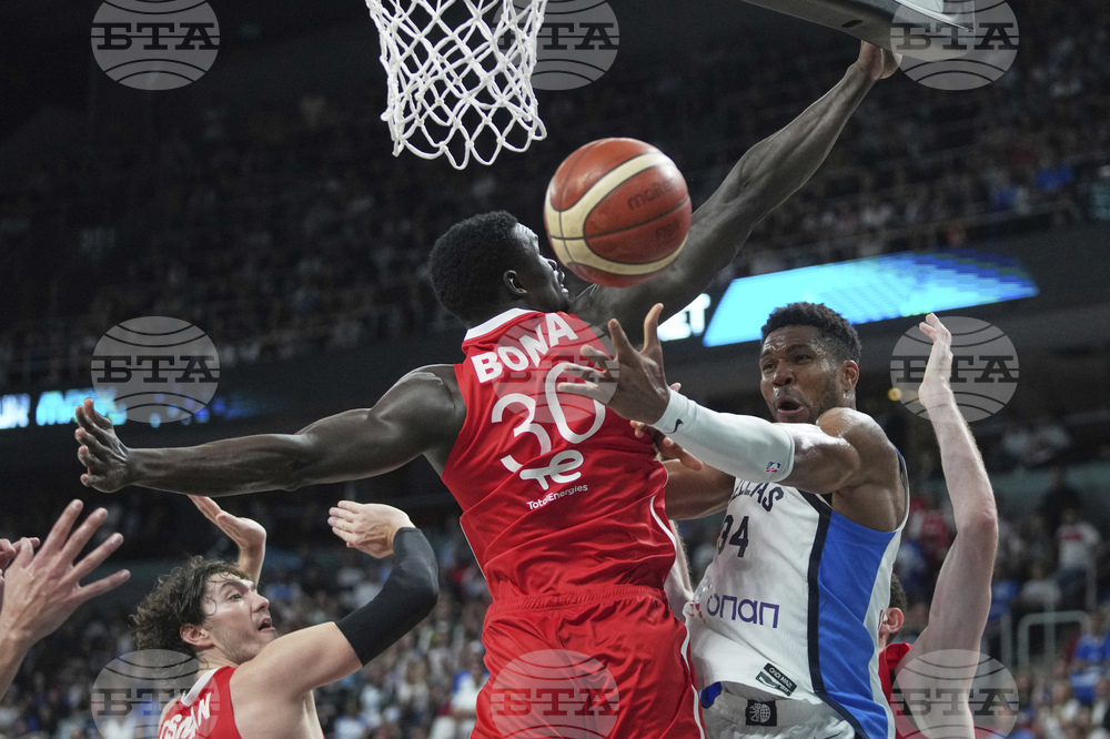 Turkey's Adem Bona, centre, in action against Greece's Giannis Antetokounmpo during the Eurobasket, European Basketball Championship semi-final match between Greece and Turkey at the Riga Arena in Riga, Latvia, Friday, Sept. 12, 2025. (AP Photo/Sergei Grits)
