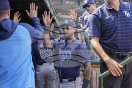 Tampa Bay Rays' Jake Mangum (28) is greeted in the dugout after scoring on a single by Nick Fortes (40) during the fourth inning of a baseball game against the Chicago Cubs, Friday, Sept. 12, 2025, in Chicago. (AP Photo/Erin Hooley)
