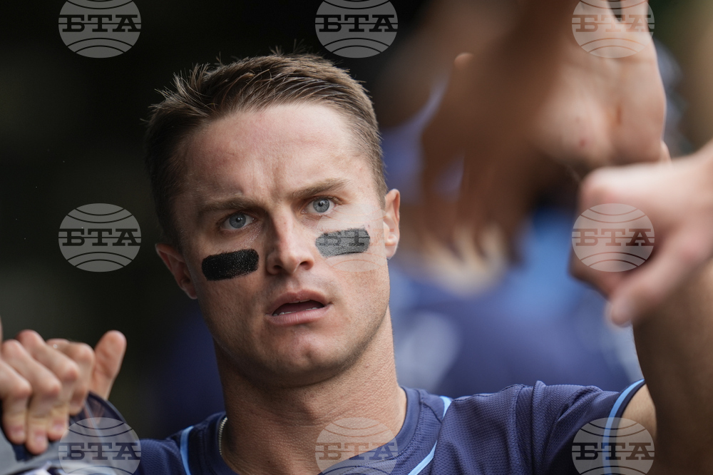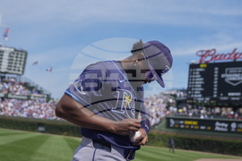 Tampa Bay Rays' Brandon Lowe (8) stands for the national anthem before a baseball game against the Chicago Cubs, Friday, Sept. 12, 2025, in Chicago. (AP Photo/Erin Hooley)