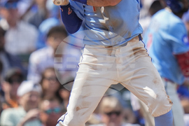 Former Chicago Cubs player Anthony Rizzo puts on a Cubs jersey after speaking during a press conference before a baseball game between the Chicago Cubs and Tampa Bay, Rays Saturday, Sept. 13, 2025, in Chicago. (AP Photo/Kamil Krzaczynski)