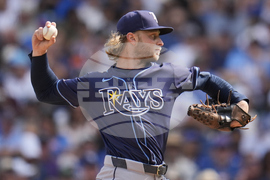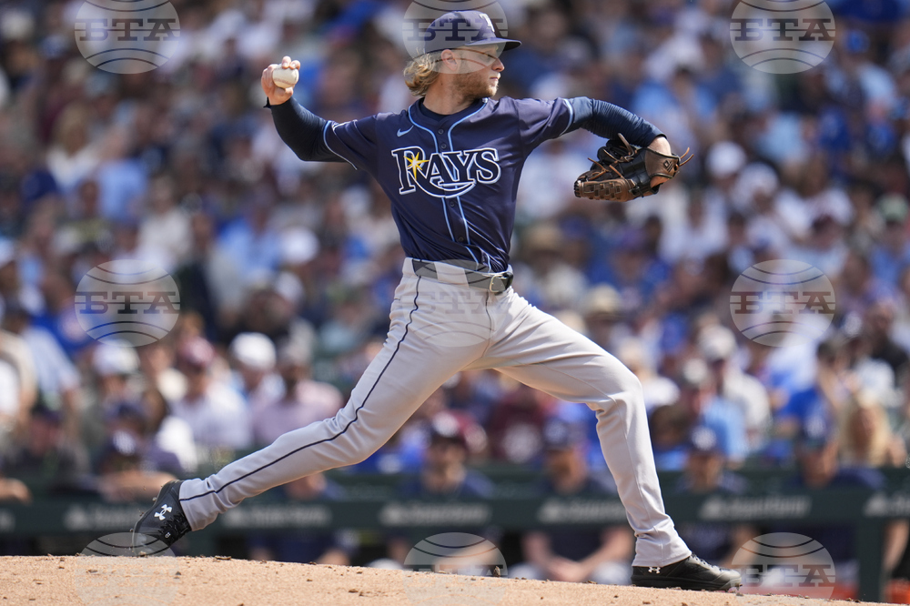 Tampa Bay Rays starting pitcher Shane Baz (11) throws against the Chicago Cubs during the second inning of a baseball game Friday, Sept. 12, 2025, in Chicago. (AP Photo/Erin Hooley)