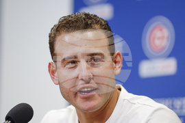 Former Chicago Cubs player Anthony Rizzo speaks during a press conference before a baseball game between the Chicago Cubs and Tampa Bay Rays, Saturday, Sept. 13, 2025, in Chicago. (AP Photo/Kamil Krzaczynski)